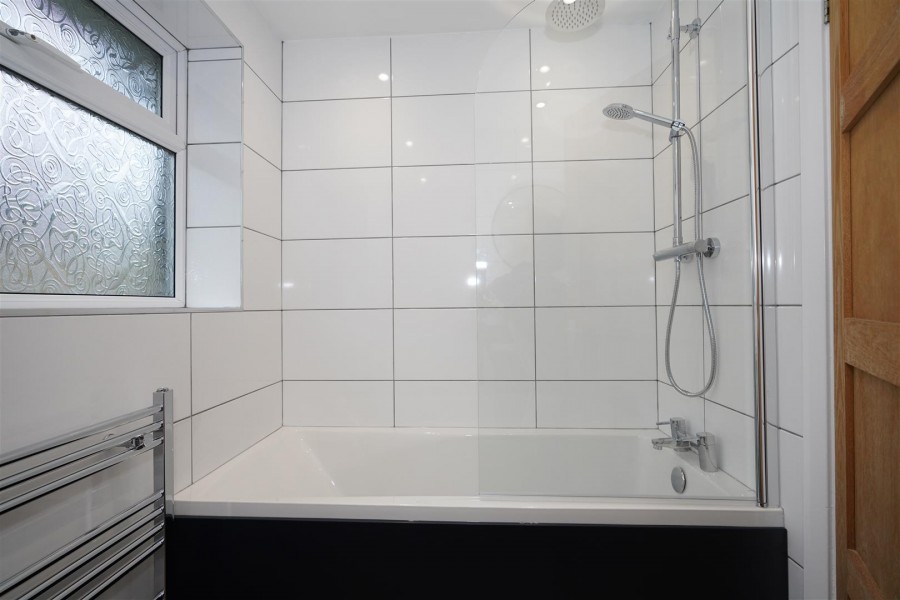 Bathroom, well presented with newly installed stylish suite including a bath with shower over, wall mounted wash hand basin with vanity unit and push button w.c.