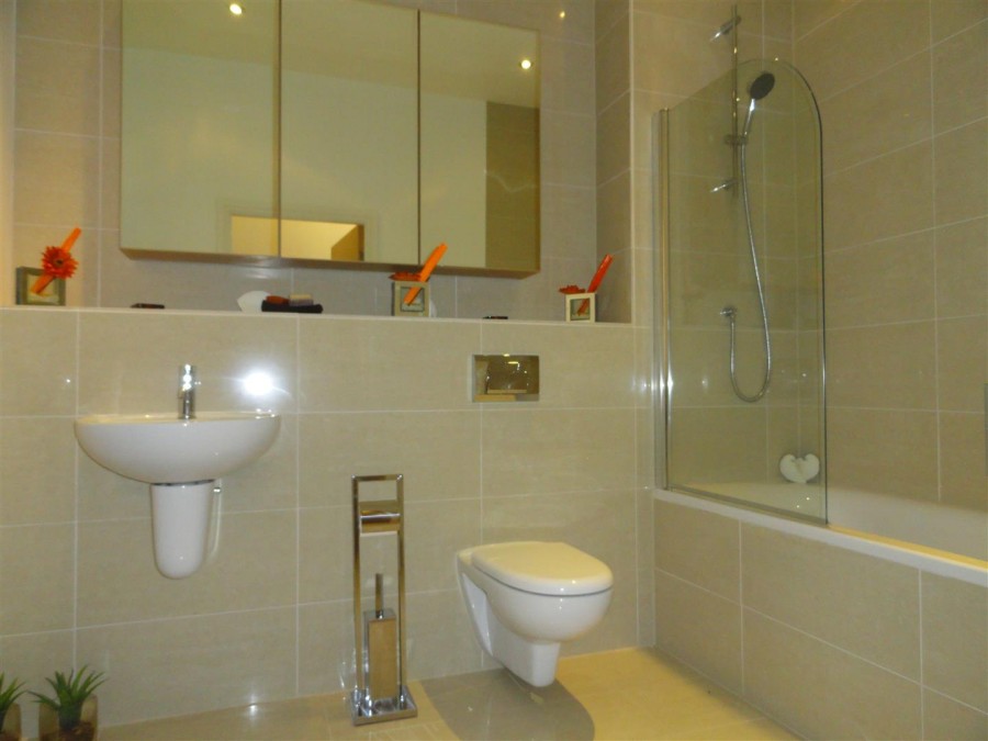 Bathroom, a fabulous spacious room fitted with contemporary fittings including; bath with shower over, wall mounted wash hand basin and W.C. Appropriately tiled with a modern finish to the walls and floor.